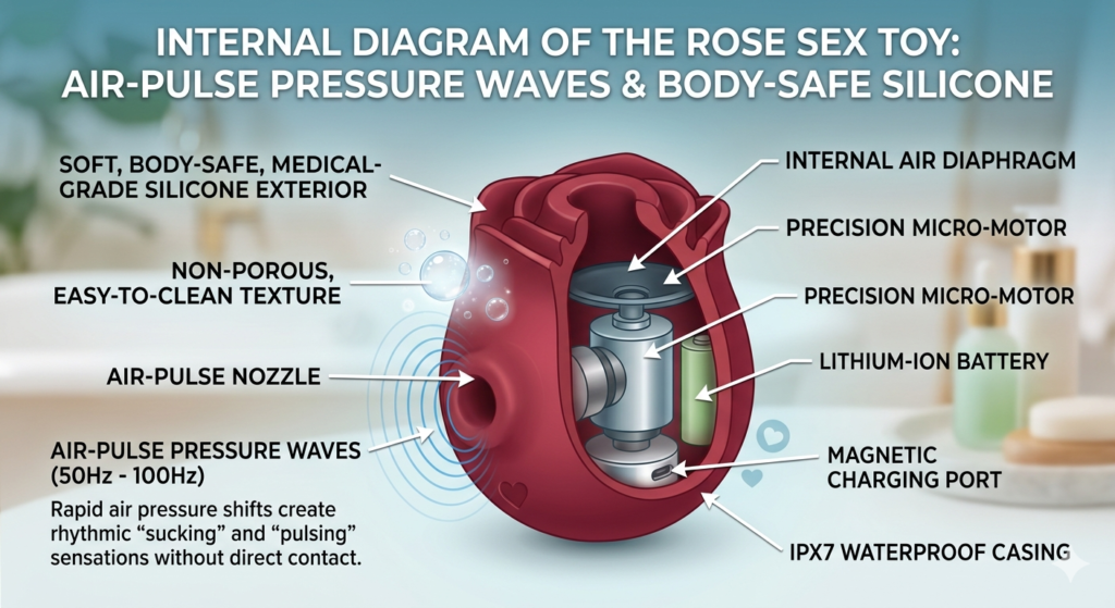 At first glance, it’s just a pretty flower. But the rose sex toy is actually a sophisticated “air-pulse” stimulator. Unlike traditional vibrators that use a motorized buzz to shake the surface of the skin, the Rose uses rapid changes in air pressure to create a “sucking” and “pulsing” sensation.