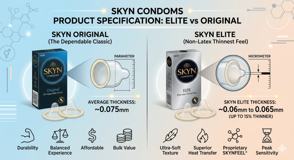 The Elite series is 15% thinner than the original SKYN condoms, with a thickness ranging between 0.06mm and 0.065mm. In the world of sexual health, that 15% is the difference between “wearing protection” and “forgetting it’s there.”